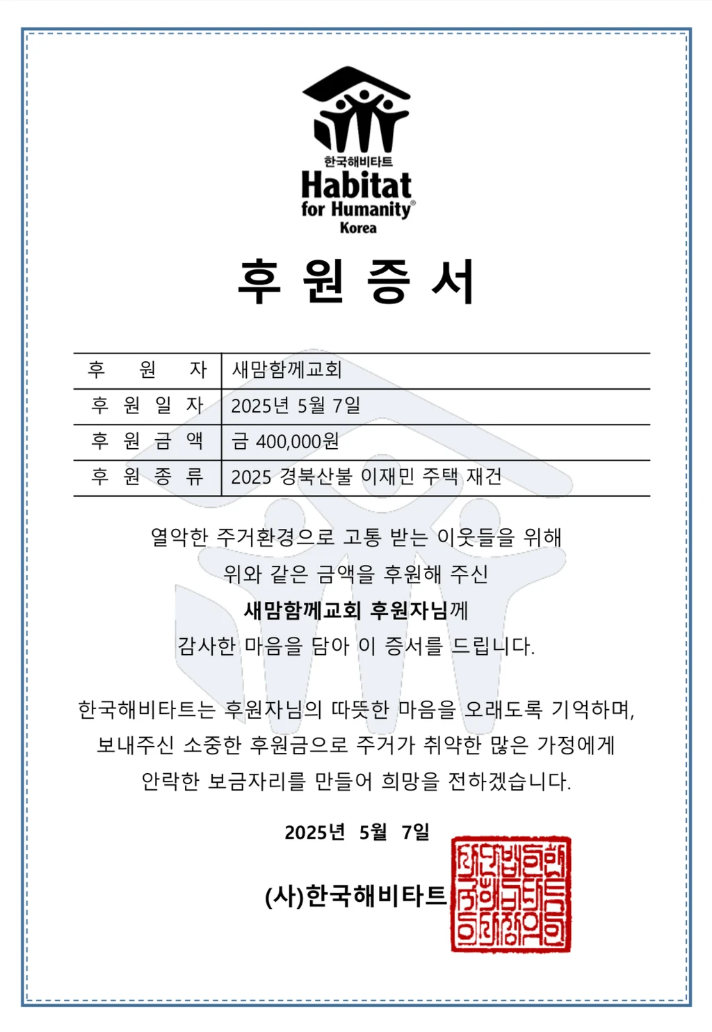 지역 사회와 경북 산불 재해로 주거 환경에 어려움을 겪고 있는 이웃들에게 전달하였습니다.